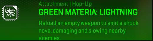 The Green Materia was a classic magical materia and did damage based on the element it was. In Apex Legends the Green is Lightning and whenever you have an empty magazine and you reload your gun it will spark a small area of effect around you.